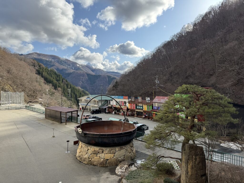 山間の自然に囲まれた場所、巨大な鍋が面白い。
