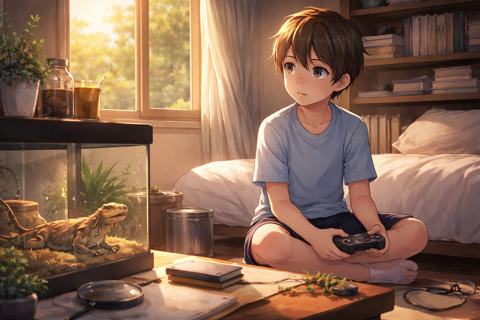 小学校高学年の男の子。理科が得意で、生き物の知識も豊富。でも、家で飼っているトカゲにエサをあげるのを何度も忘れます。